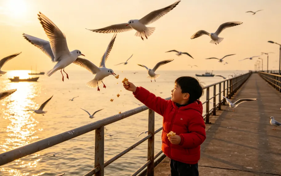 第二天主打轻松漫游,带娃感受青岛的老城韵味。上午去栈桥,这里的海鸥还没完全飞走,记得给娃戴帽子防“空袭”,买上一包海鸥食,看着孩子追着海鸥跑,画面治愈又温馨。