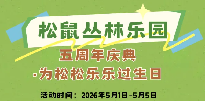 今年“五一”恰逢乐园五周年,吉祥物“松松”“乐乐”将带来超多互动福利:每天11:00、15:00、19:00,会有玩偶巡游,小朋友可以和松松乐乐握手、合影;还有动物表演、丛林探险、亲子手工等活动,让孩子在玩乐中亲近自然。