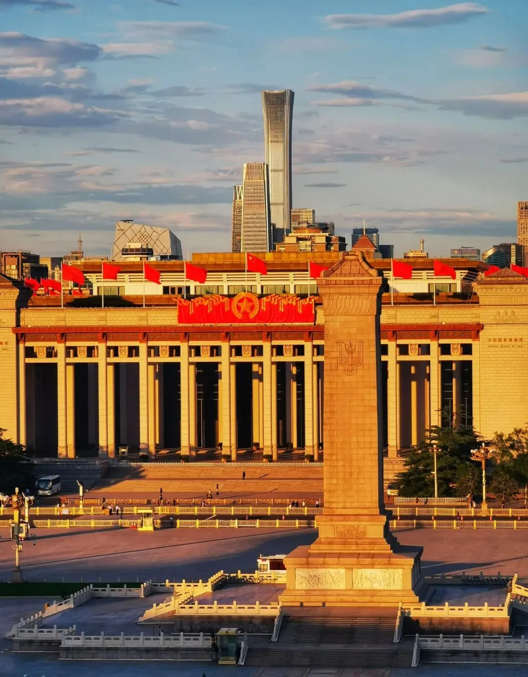 天安门广场以人民英雄纪念碑为中心,南边是正阳门和毛主席纪念堂,东边是国家博物馆,北边是旗杆和天安门城楼,西边是人民大会堂。如果您到了广场上,可以站在这里欣赏四周的建筑和布局,观察人群。广场上有很多玩耍的孩子和散步的老人,氛围非常祥和宁静。在夕阳下,您可以坐下来,静下心来欣赏天安门的日落。