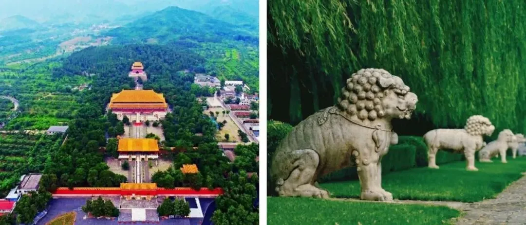 长陵为永乐大帝陵寝,殿宇恢宏,神路石像生肃穆而立,春日古松苍翠映红墙。