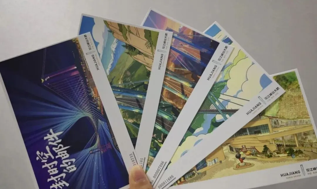 定制明信片设计独具巧思,正面以花江峡谷大桥全景为核心元素,搭配山间云雾与落日余晖,或是夜间灯光秀的震撼,将大桥的磅礴与柔美完美融合,背面预留书写空间,可写下旅途感悟、祝福话语,还可加盖专属纪念邮戳,无论是自留收藏,还是邮寄给亲友,都能传递一份专属的假期心意。