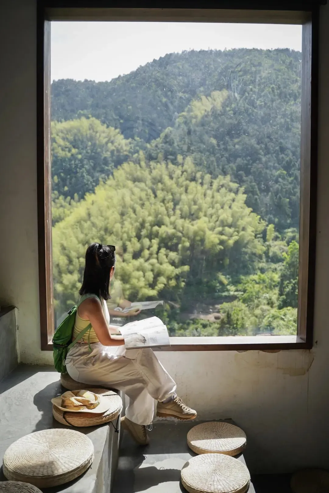 📸【机位安利】别只拍书架。最绝的视角是书店那扇正对着山谷的落地大窗。这个季节,山间的云雾极易在雨后升腾,站在此处,书香与云海共生。那是一种自带“灵魂栖息感”的构图,不用任何滤镜,光影就是最好的调色师。