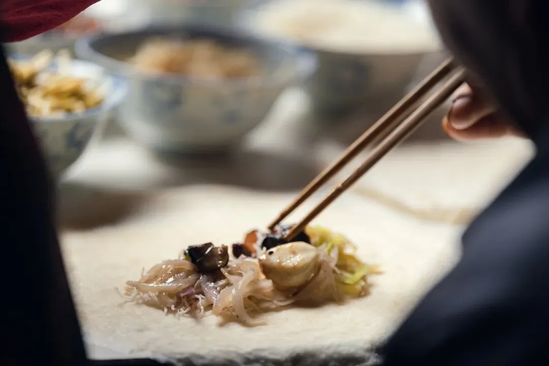 饼皮薄如蝉翼,近乎透光。馅料则极其讲究:豆腐干、鱿鱼丝、竹笋、豆芽、田螺头……十几种菜肴切丝炒熟。自己动手,将饼皮卷成竹筒状,这种丰富的层次感,是任何大厨都无法复刻的市井幸福。
