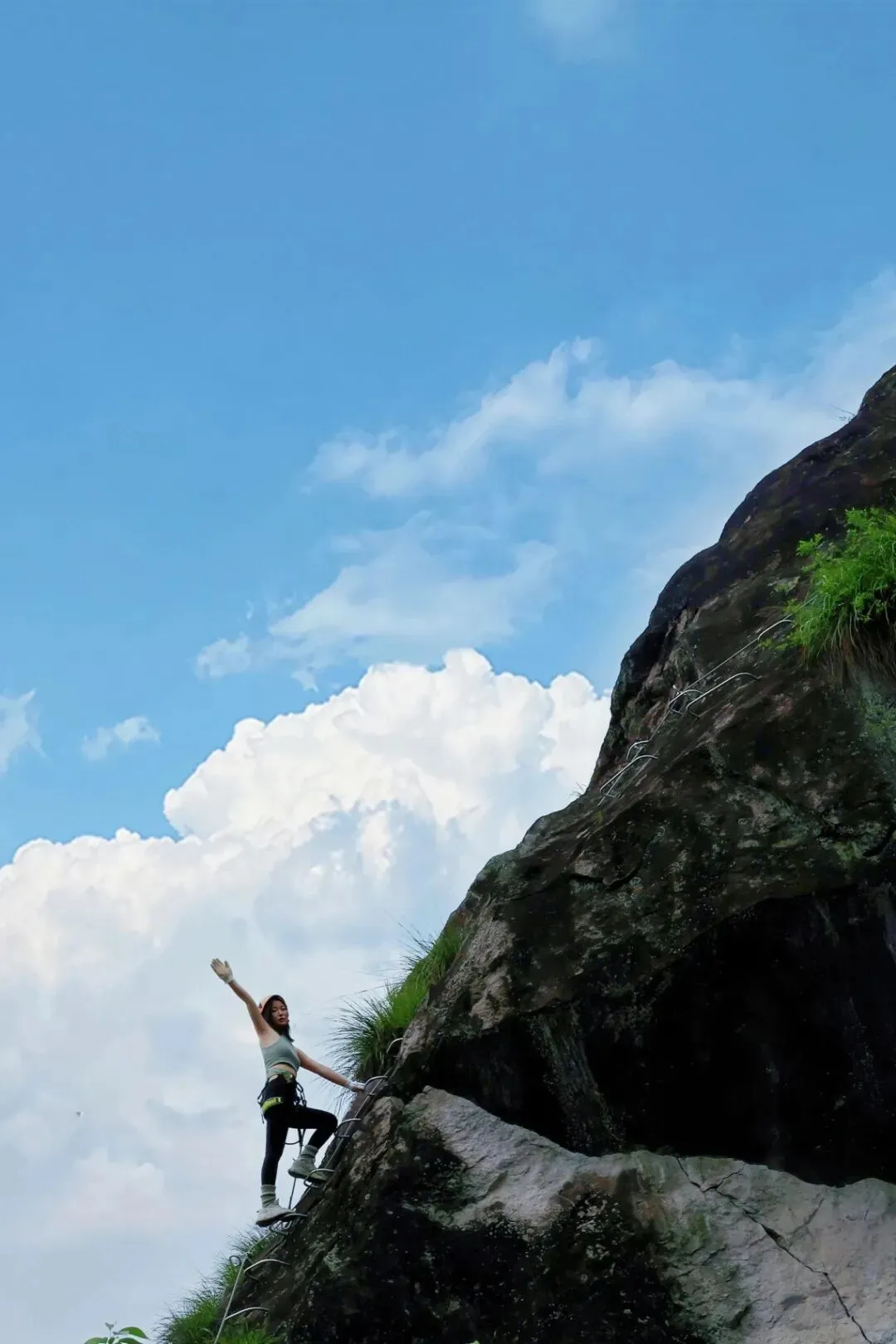 双童山的起源极具浪漫色彩,主峰双峰突兀,远眺如两名童子相对读书。但别被这文雅的名字“骗”了,这里藏着最美的步道和最硬核的高空项目。