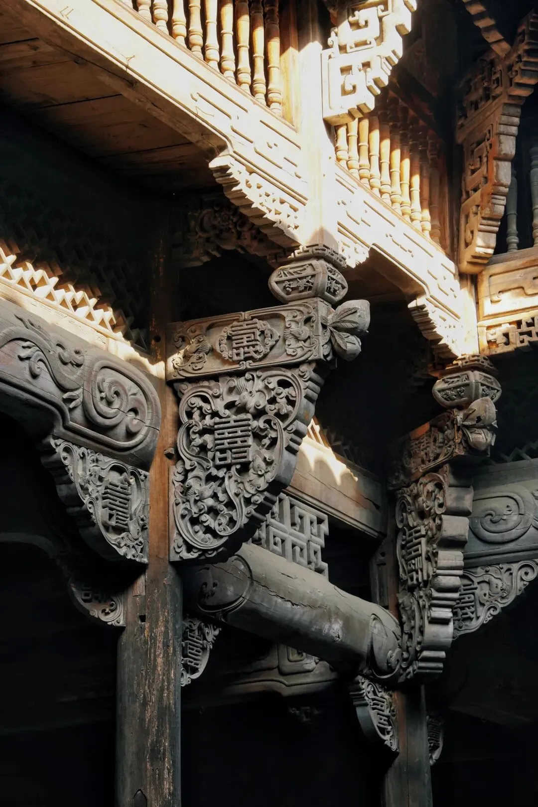 【深度读图】走进百寿厅、武技楼、竹菊轩,每一处细节都在考验你的耐心。这里有204个不重样的繁体“寿”字,有牛腿上表情神态逼真的猴、鹤、鱼,更有小若指尖的蝙蝠、鱼、石榴。最令人惊叹的是那一组组劳动场景的雕刻:砍柴的樵夫、锄地的农夫、垂钓的渔夫……