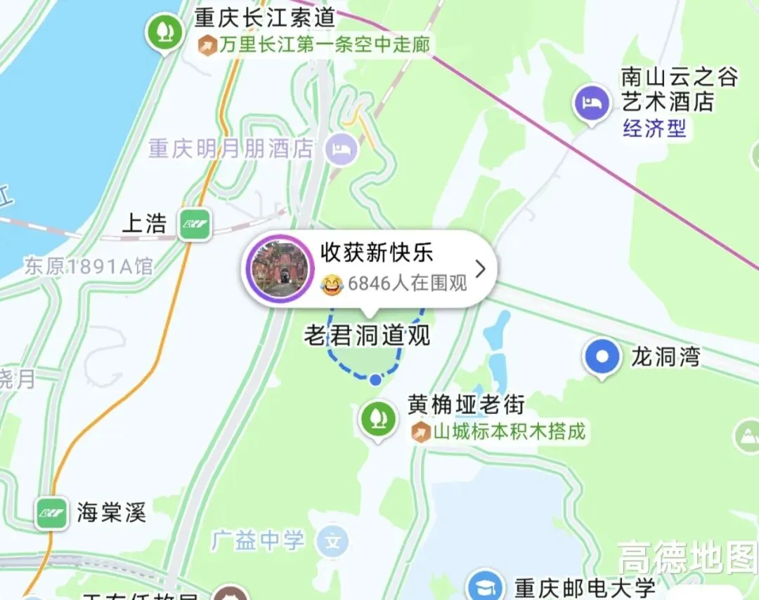 1.乘坐环线到上浩站 从3C出口出站,可以从海棠新街爬坡上来,到西门,差不多30分钟(看导航); 或者从4A出口出站,在海棠溪新街站乘坐347路公交车上山在崇文路口站下车,步行到东门。 2.自驾就直接搜索“老君洞道观”,这里有停车场。 山上附近景点推荐:黄桷垭老街,南山一棵树...