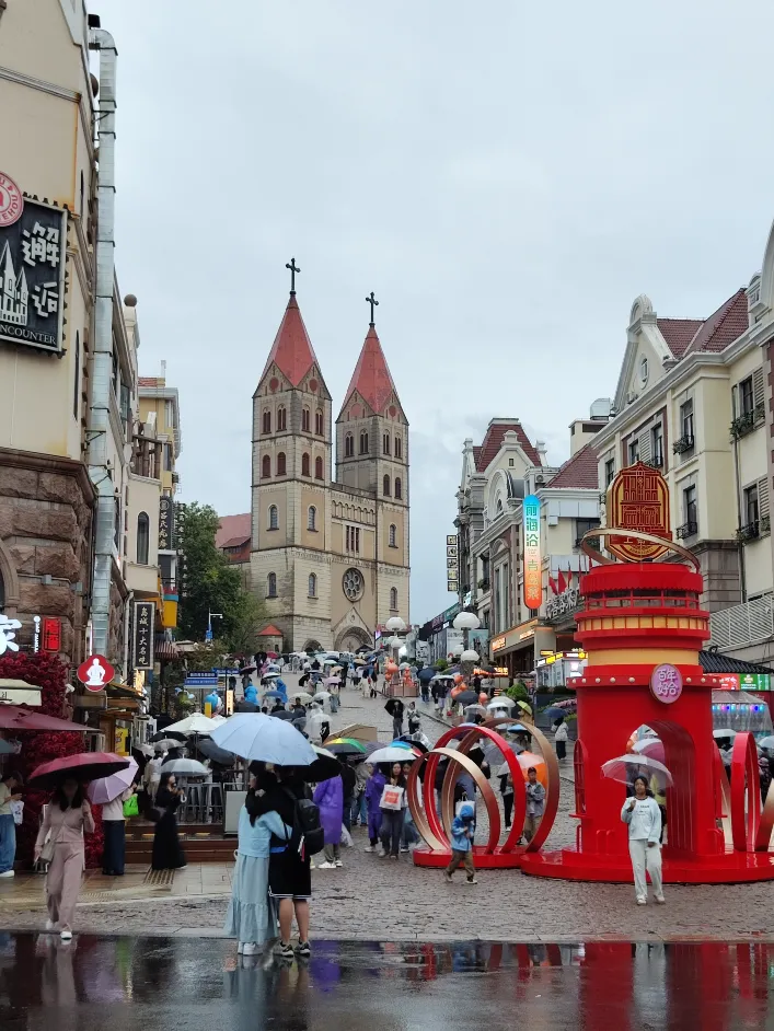 4、圣弥厄尔大教堂:天主教堂,始建于1932年,是青岛最大的哥德式建筑。如果需要进入教堂内部参观,门票10元/人。教堂外人气很高,属于来青岛基本都会去的地方,所以下雨天也不缺打卡拍照的人。