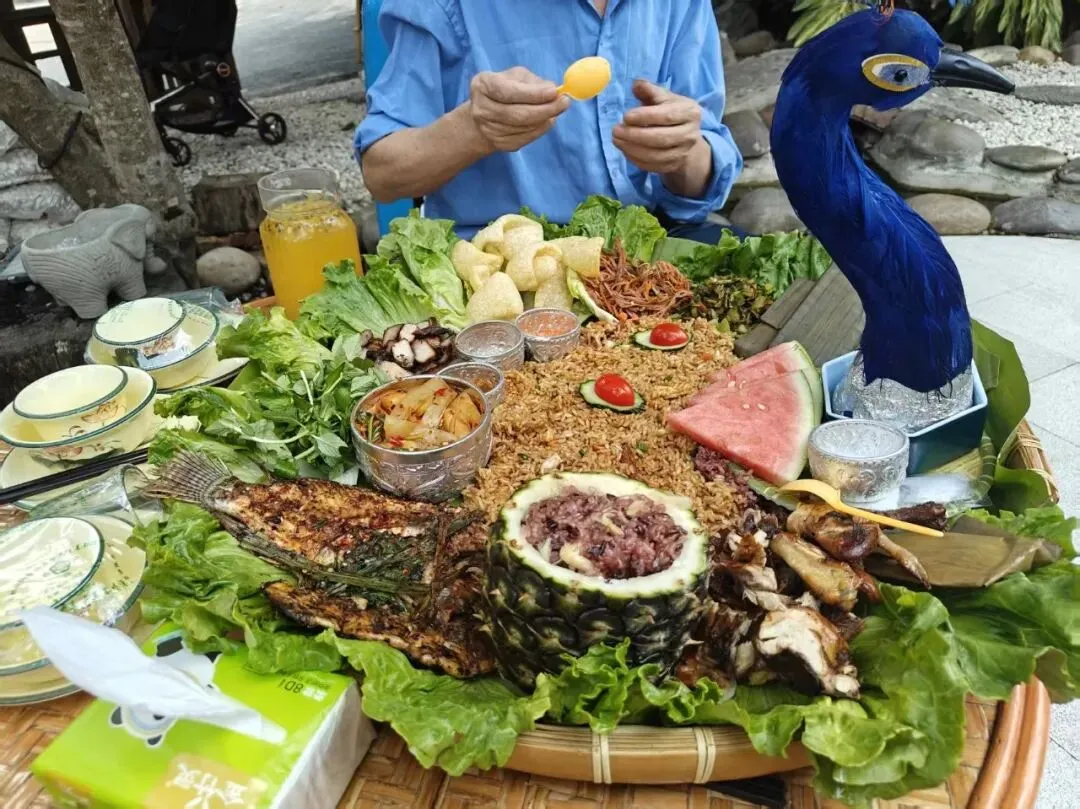 由于小宝宝中途哭闹,我们只好提前结束拍摄。中午就近前往曼龙匡傣味餐厅 180 号用餐,这是一家地道的傣味菜馆,不少当地人都会前来光顾。招牌菠萝饭口感香甜美味,其余傣味菜品口味偏特色,不太合我们的胃口,店内也没有配备儿童座椅。有趣的是,妈妈还特意把菠萝壳里的果肉也吃掉了。