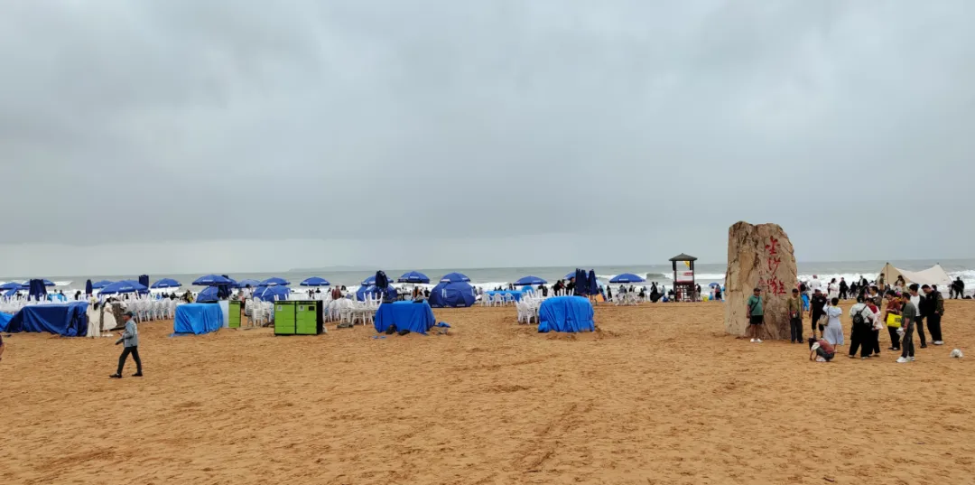 8、金沙滩:是中国沙质最细、面积最大、风景最美的海水浴场之一,被称为“亚洲第一滩”,景区旁建有亚洲最大的啤酒主题广场。也是免费景区,无需门票,全天开放,我们是从金沙滩西门进的。下雨天海浪非常的猛,远观即可。然后浴场每年是有开放时间的,开放期间才可以在游泳区下水游泳啥的。免费冲脚的设施看到挺多的,放心玩沙。内部有观光车,线路:啤酒城<->电影学校,观光车全程30元/人、单程20元/人。