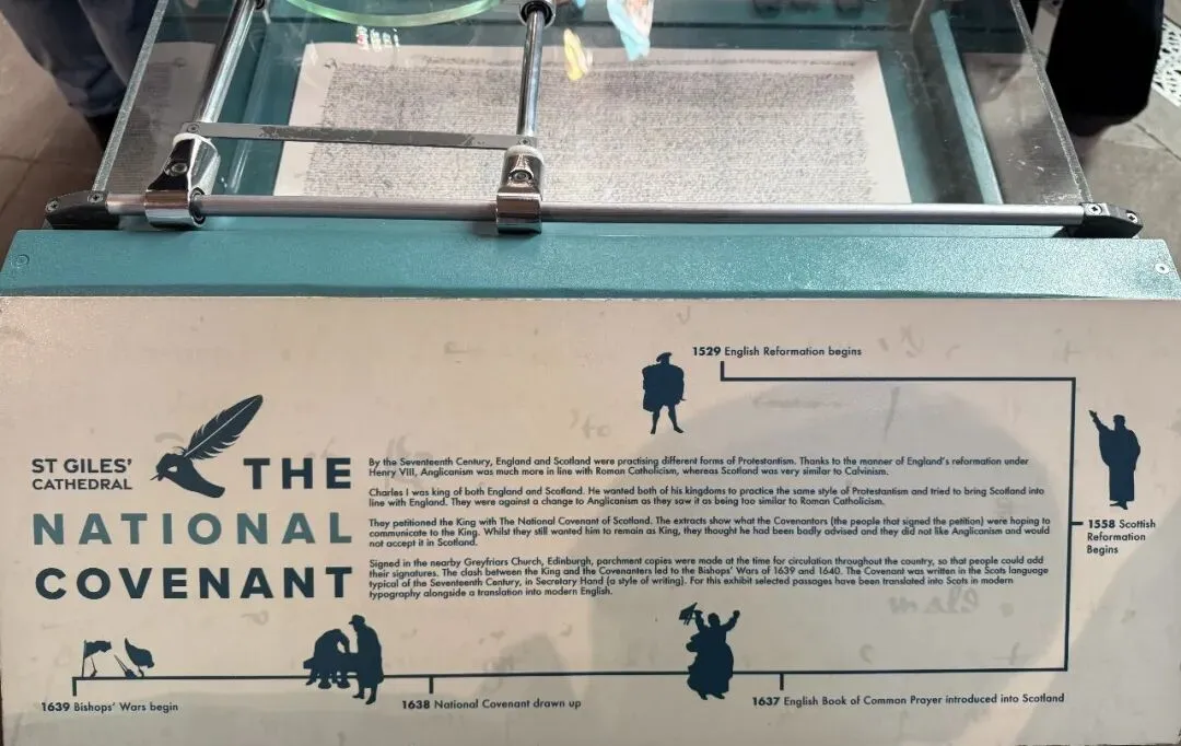 在皇家一英里上,我还参观了圣吉尔斯大教堂。里面最重要的一件文物,是1638年的《国家盟约》,上面密密麻麻全是签名,为的就是反抗当时英国国王强行在苏格兰推行英格兰国教。这不就跟刚才看的抗议游行产生共振了么!