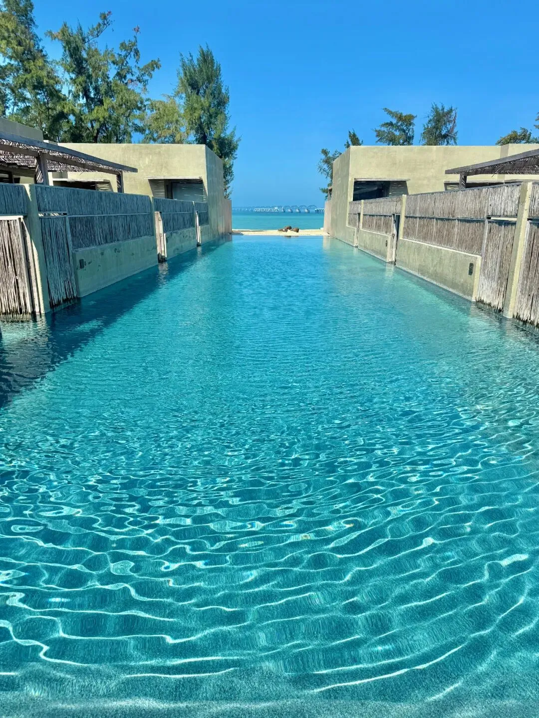 无边泳池直面蓝桥海滩,澄澈池水与蔚蓝碧海无缝衔接。至享夕阳海景观赏位,推门即达沙滩,邂逅海岛独有的松弛与浪漫