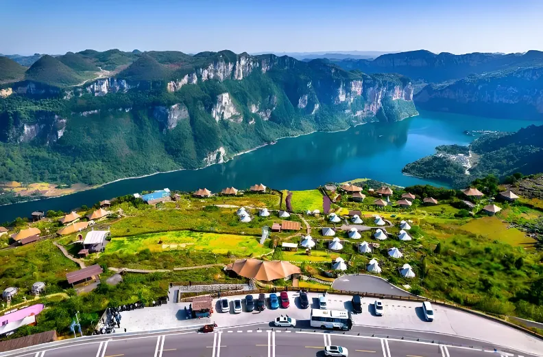 在黔西市化屋村,这里是千里乌江的精华段。湖水清得像碧玉,两岸的山像刀削一样陡,还有瀑布挂在崖壁上。您一定要坐游船,或者在鸭池河大桥上俯瞰,那景色真的“头上天一线、峡中水一弯”。最近化屋村还有“村歌”展演,特别有烟火气。这里不收大门票,但游船票要100多块,如果您住璞墟民宿,推开窗就能看,省了船票钱。