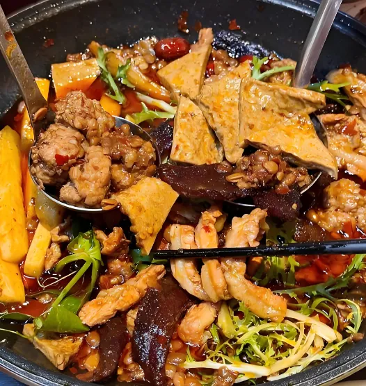 毕节人对豆干是真爱,这火锅的豆干吸饱了豆豉汤汁,又嫩又韧,咬一口爆汁。锅底还有油渣、蒜苗,那汤底浓稠挂壁,拌饭能吃三碗。推荐吃“骟鸡点豆腐”那种老店,或者路边的砂锅店。人均35块,吃到撑。记得加一份折耳根,那是灵魂!