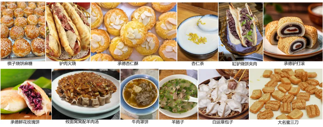 ➧ 点心:缸驴烧饼夹肉,驴肉火烧(保定),牛肉罩饼,羊肠子,白运章包子,杏仁茶,攸面窝窝配羊肉汤,棋子烧饼麻糖,承德鲜花玫瑰饼,承德驴打滚,承德杏仁酥,大名蜜三刀(邯郸大名);