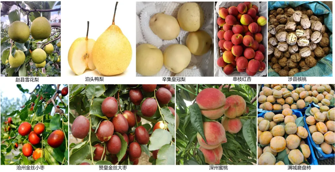 ➧水果:赵县雪花梨,泊头鸭梨(晋州),辛集皇冠梨,沧州金丝小枣,赞皇金丝大枣,满城磨盘柿,串枝红杏,深州蜜桃,涉县核桃(邯郸涉县);
