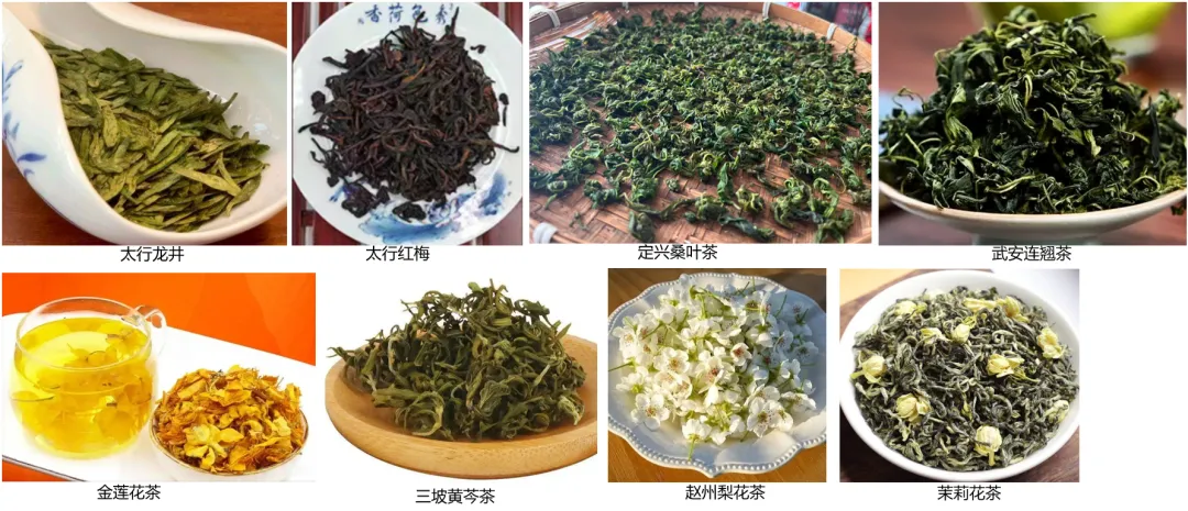 ➧茶叶:太行龙井(五岳山茶,石家庄灵寿),太行红梅(石家庄灵寿),河北茉莉花茶,三坡黄芩茶(三坡茶),金莲花茶,赵州梨花茶,武安连翘茶(打老儿茶,邯郸武安长寿村),定兴桑叶茶;