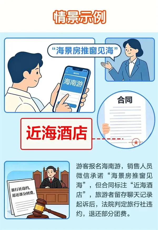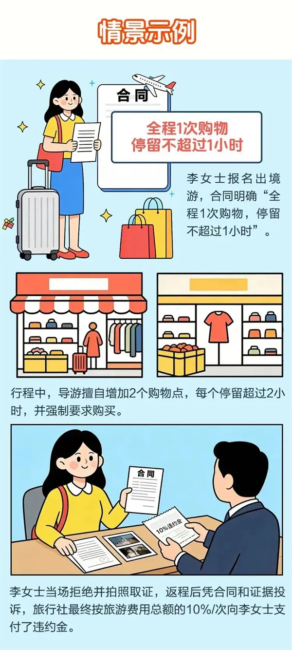 04 规范签订合同 无论是纸质版还是电子合同,均需确保条款完整。电子合同需通过合法平台签署,保存完整记录以保障法律效力。远程签订时,要求旅行社发送含封面、签章页、行程附件等的完整版合同。 小贴士 ① 游客需仔细核对宣传旅行产品的旅行社和签订合同的旅行社以及行程接待的旅行社是否一致,严防签约旅行社未经同意擅自将旅游者转给其他旅行社接待。签订合同的旅行社委托其他旅行社进行接待,要征求游客书面同意并在合同中明确或签订补充合同。 ② 推荐签订电子合同,如遇纠纷,便于相关部门调取证据。 二、合同内容的核心审查要点 05 逐项核对法定14项内容 重点、逐项核对《旅行社条例》第二十八条规定的旅行社与旅游者签订旅游合同应载明事项,共计14项。包括: (一)旅行社的名称及其经营范围、地址、联系电话和旅行社业务经营许可证编号; (二)旅行社经办人的姓名、联系电话; (三)签约地点和日期; (四)旅游行程的出发地、途经地和目的地; (五)旅游行程中交通、住宿、餐饮服务安排及其标准; (六)旅行社统一安排的游览项目的具体内容及时间; (七)旅游者自由活动的时间和次数; (八)旅游者应当交纳的旅游费用及交纳方式; (九)旅行社安排的购物次数、停留时间及购物场所的名称; (十)需要旅游者另行付费的游览项目及价格; (十一)解除或者变更合同的条件和提前通知的期限; (十二)违反合同的纠纷解决机制及应当承担的责任; (十三)旅游服务监督、投诉电话; (十四)双方协商一致的其他内容。 小贴士 切记,这是游客维权的重要保障。警惕漏填、少填、缺项漏项、模糊填写等情况,在签订旅游合同时需要求旅行社对14项内容完整填写,真实清晰明确表述,并可要求附加《旅游行程单》等作为合同组成部分。 06 核对服务安排及标准 重点核对旅游合同中对交通、住宿、餐饮、门票等服务安排、标准,以及费用拆分或单独表述的情况,签订包价旅游合同。 新版合同要求 新版合同《旅游行程单》明确要求:住宿服务应当写明住宿场所的名称、地点、星级,非星级住宿场所应当注明是否有空调、热水、独立卫生间;交通服务应当明确交通工具及档次等级、出发时间以及是否需中转等信息。行程单用语不得出现“准×星级”“豪华”“仅供参考”“以××为准”“与××同级”等不确定用语。 小贴士 拒绝“准四星”“精品酒店”等模糊表述,要求旅行社标注具体酒店名称、房型;核对费用包含范围,明确是否包含景区交通、保险等附加费用。 07 核对购物及自费项目安排 重点核对合同中“旅行社安排的购物次数、停留时间及购物场所的名称,需要旅游者另行付费的游览项目及价格”。 赔偿责任 根据新版合同,境内旅游、出境旅游、赴台旅游: ① 擅自增加购物次数、延长停留时间的,每次向游客支付旅游费用总额10%的赔偿金; ② 强迫或者变相强迫购物的,每次支付旅游费用总额20%的赔偿金; ③ 擅自安排另行付费旅游项目的,旅行社应当承担该项目费用; ④ 游客在合同约定的购物场所买到假冒伪劣商品的,旅行社应当负责挽回或赔偿直接经济损失。 > 境内一日游另有规定:未与旅游者协商一致安排另行付费项目的,全额退还另行付费旅游项目费用;存在强迫参加的,每安排或强迫一次,另支付旅游费用总额20%的赔偿金。