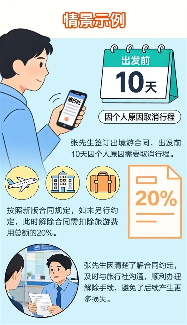 小贴士 游客在旅行过程中发现旅行社或导游未按照旅游合同约定擅自推销自费项目、增加购物场所及次数的,极大可能落入消费陷阱,合法权益受到侵害。 08 核对合同解除及变更规则 重点核对合同中“解除或者变更合同的条件和提前通知的期限”。 新版合同规定 新版合同对解除合同的费用扣除比例作出明确规定,不同类型的旅游规则有所不同: ① 境内旅游:旅游者在行程开始前7日以上提出解除合同的,旅行社应当向旅游者退还全部旅游费用;行程开始前6日至4日解除,扣除旅游费用总额的20%;前3日至1日解除,扣除40%;出发当日解除,扣除60%。 ② 出境旅游、赴台旅游:旅游者在行程开始前30日以上提出解除合同的,未办理签证/签注的,出境社应当向旅游者退还全部旅游费用;已办理签证/签注的,应当扣除签证/签注费用(旅游者自办的除外);行程开始前29日至15日解除,扣除旅游费用总额的5%;前14日至7日解除,扣除20%;前6日至4日解除,扣除50%;前3日至1日解除,扣除60%;出发当日解除,扣除70%。 ③ 境内一日游:旅游者出发前12小时以上(含12小时)解除,支付实际发生的费用;12小时内解除,支付实际发生的费用加旅游费用总额20%的违约金(实际发生的费用与违约金总计不超过旅游费用总额)。 > 通用规则(适用于境内旅游、出境旅游、赴台旅游、研学旅游):双方可以另行约定扣费比例,但约定比例不得高于上述标准;如按约定比例扣除的费用低于实际发生的费用,游客按实际发生的费用支付,但最高不超过旅游费用总额。
