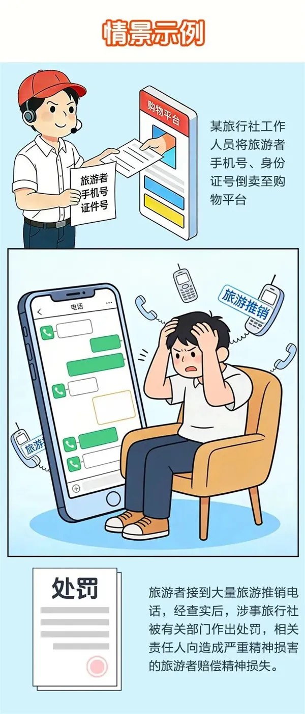 小贴士 部分线上平台及网络招徕人员私自收取游客押金、保证金,而签订合同的旅行社并未实际收取,极易造成纠纷,这是投诉高频事项。建议游客直接与旅行社签订合同,商定押金、保证金交纳事宜,如向招徕人员交纳,必须由旅行社开具收据或发票,以保障自身权益。 11 核对安全保障责任 新版合同新要求 旅行社应当对提供的产品和服务进行安全评估,不组织旅游者进入未开发、开放区域;对可能危及人身、财产安全的,应当向旅游者作出真实的说明和明确的警示;突发事件或者旅游安全事故发生后,立即采取必要的救助和处置措施,依法履行报告义务,并对旅游者作出妥善安排。同时,旅行社应当为旅游者发放用固定格式书写、由旅游者填写的安全信息卡(内容包括旅游者的姓名、血型、应急联络方式等),出境旅游的,安全信息卡应当使用中英文书写。 小贴士 游客出行前主动索要安全信息卡,确认旅行社已留存安全告知记录,明确应急联系方式;遇旅行社安排进入未开发区域游览的,立即拒绝并留存证据。 12 核对个人信息保护条款 新版合同新要求 新版合同明确规定,旅行社依法对旅游者个人信息保密。除为合同履行的需要,旅行社不得擅自以收集、储存、使用、加工、传输、买卖、提供、公开等方式处理旅游者的个人信息。违反规定的,按照《中华人民共和国个人信息保护法》等相关规定承担相应责任。