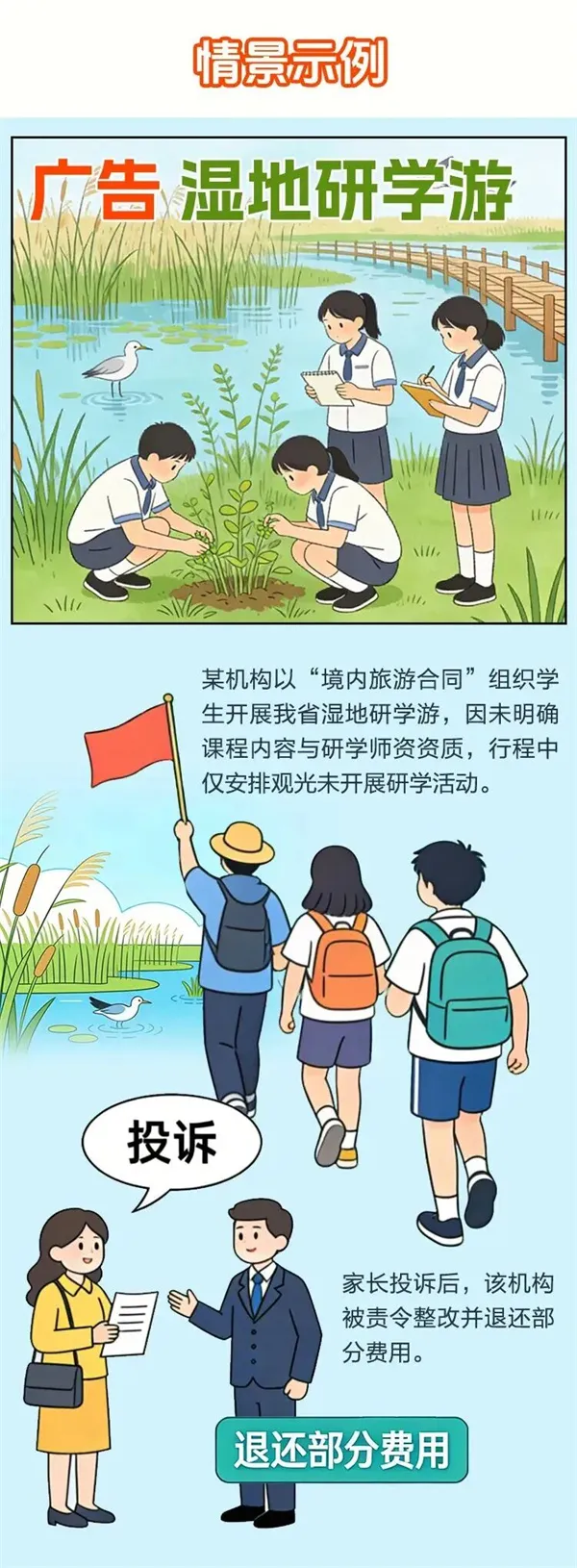 小贴士 游客应拒绝旅行社过度收集信息(如非必要的生物识别信息、财产信息);发现信息泄露的,立即向12345热线投诉,要求删除信息,造成严重精神损害的要求赔偿损失。 13 研学旅游使用专用合同 新版合同新要求 新版合同新增《研学旅游合同(示范文本)》,研学业务应当使用专用合同。需在合同中明确:研学行程安排、研学课程内容、时长、地点、交通安排、住宿安排、用餐安排等;研学服务费用(包括材料用具费用、手册用书费用、师资费用、开发设计费用等)、必要的签证/签注费用(旅游者自办或者不需要办理的除外)、交通费、住宿费、餐费、旅行社统一安排的景区景点门票费、行程中安排的其他项目费用、导游服务费、旅行社(含地接社)的其他服务费用;师资安排(应当安排与研学课程相匹配的师资)。