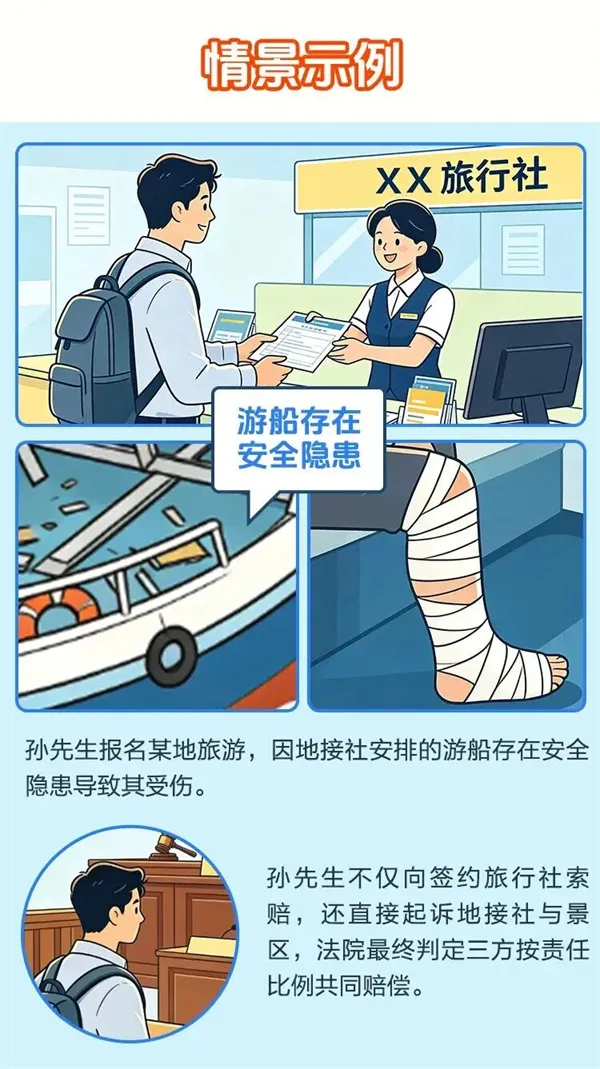 小贴士 不轻易相信口头承诺,要求将所有约定(如酒店房型、车辆标准、景点游览时间)写入合同;全程保存与销售人员、导游的沟通记录,拒绝“先付款后看合同”。 三、履行合同中的风险防范 15 核实导游、领队资质 游客在出行时要核实旅行社委派的导游人员是否持有导游证。出境旅游的,是否为旅游团队安排符合《中华人民共和国旅游法》《旅行社条例》《导游人员管理条例》《中国公民出国旅游管理办法》等法律法规规定的领队全程陪同。 小贴士 出境旅游未安排领队的旅行团属违规,游客权益难以保障。 16 留存全程证据 保存合同原件、付款凭证、行程单、沟通记录(微信、电话录音、短信等),对违反合同约定的情况及时拍照、录像取证。 17 拒绝违规行为 游客遇到导游擅自增加购物点或自费项目等严重违反合同,侵害游客权益的行为时,应予以拒绝并进行投诉,必要时请相关行业主管部门协助处置。 18 遵守当地风俗习惯 游客应主动了解旅游目的地的宗教信仰、礼仪习俗,做到文明旅游,避免因言行不当引发冲突。旅行社应在行程前向游客书面或口头告知重要风俗禁忌,导游需在行程中及时提醒。 小贴士 游客可主动向旅行社了解目的地风俗禁忌。 四、维权与争议解决 19 协商解决与投诉举报 游客因旅游合同执行或行程安排等问题与导游、旅行社等发生纠纷,可选择与旅行社协商解决,要求按合同履约或合理补偿、赔偿。如协商不成,可拨打当地“12345”投诉电话进行投诉举报,配合行政主管部门调查处理。 小贴士 投诉举报应当提供相关证据并客观、真实反映问题,以免影响自身信用。 20 司法途径与维权渠道拓展 游客可按旅游合同约定的方式,在合同确认的所在地法院起诉,或向仲裁委员会申请仲裁,通过法律途径解决问题。 新版合同新变化 新版合同明确,如组团社与地接社、履行辅助人约定游客可以直接请求其履行合同,则地接社、履行辅助人未按约定提供服务的,游客可以选择向地接社、履行辅助人或者组团社主张权利。这为游客维权拓宽了渠道。