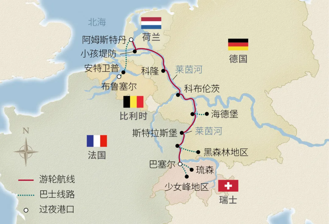 这么一番了解下来,游轮旅行显然更符合我们的出行需求。后面又经过一番对热门游轮公司的筛选,我们发现维京就很不错。维京游轮进入中国市场已有10年时间,累计服务中国宾客近10万人,凭借良好的口碑和高认可度,至今已斩获超过450个国内外权威奖项,品牌实力有目共睹。 我还了解到,它们家有河轮、海轮两个品线,河轮航线会覆盖莱茵河与多瑙河沿岸的10国29个目的地,而今年的海轮航线则会于今年盛夏沿着地中海航行。我征询了爸妈的意见,他俩都说这次更想体验维京经典的河轮航线,看看莱茵河沿岸的风景。 综合比对下,我们一致觉得“13日比利时与魅力莱茵”这条河轮+陆地游航线很符合我们的预期,8月启航,一共将会游览5个国家、12座城市,其中我们尤其感兴趣的少女峰、科隆、阿姆斯特丹等等几个城市就包含在内。
