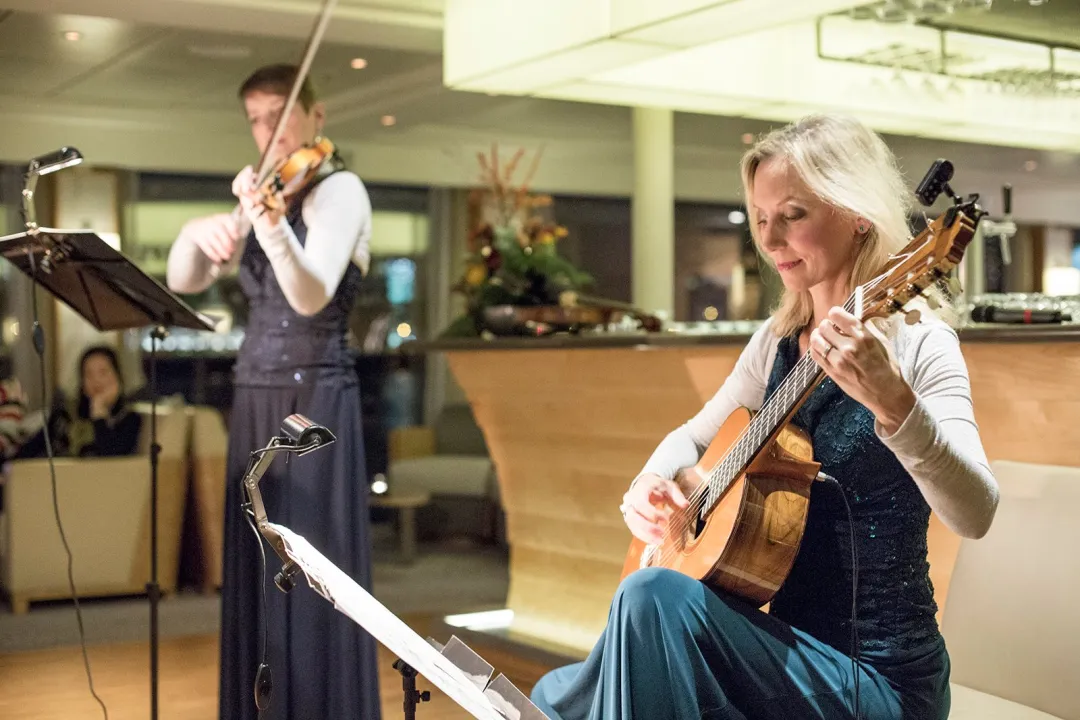 船上还有丰富文娱活动,我们可以在航行的闲暇时光跟着主厨学习地道的当地美食、参加小课堂熟悉当地语言,也可以坐下来聆听当地乐师演奏的古典音乐名曲等等。这些轻松的时刻,不仅是行程中的美好点缀,也是旅途中结识新朋友的契机。