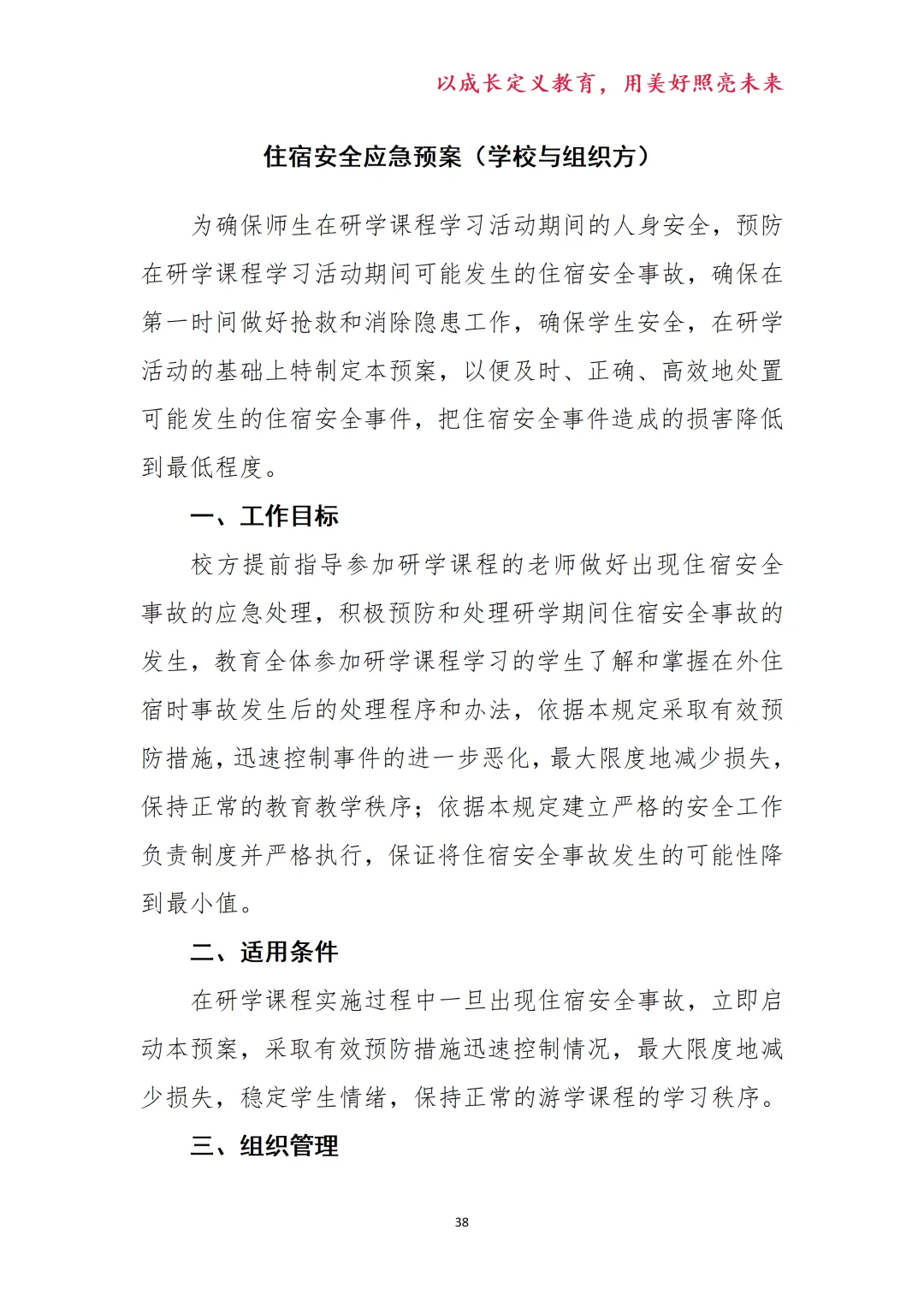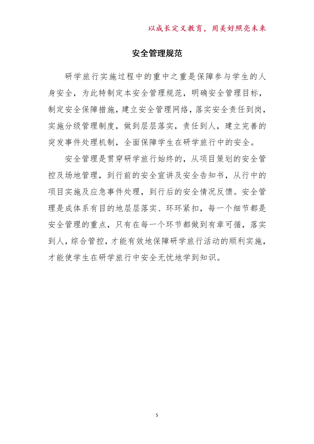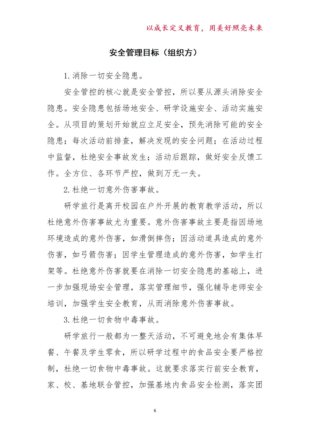 研学旅行实施过程中的重中之重是保障参与学生的人身安全,为此特制定本安全管理规范,明确安全管理目标,制定安全保障措施,建立安全管理网络,落实安全责任到岗,实施分级管理制度,做到层层落实,责任到人,建立完善的突发事件处理机制,全面保障学生在研学旅行中的安全。