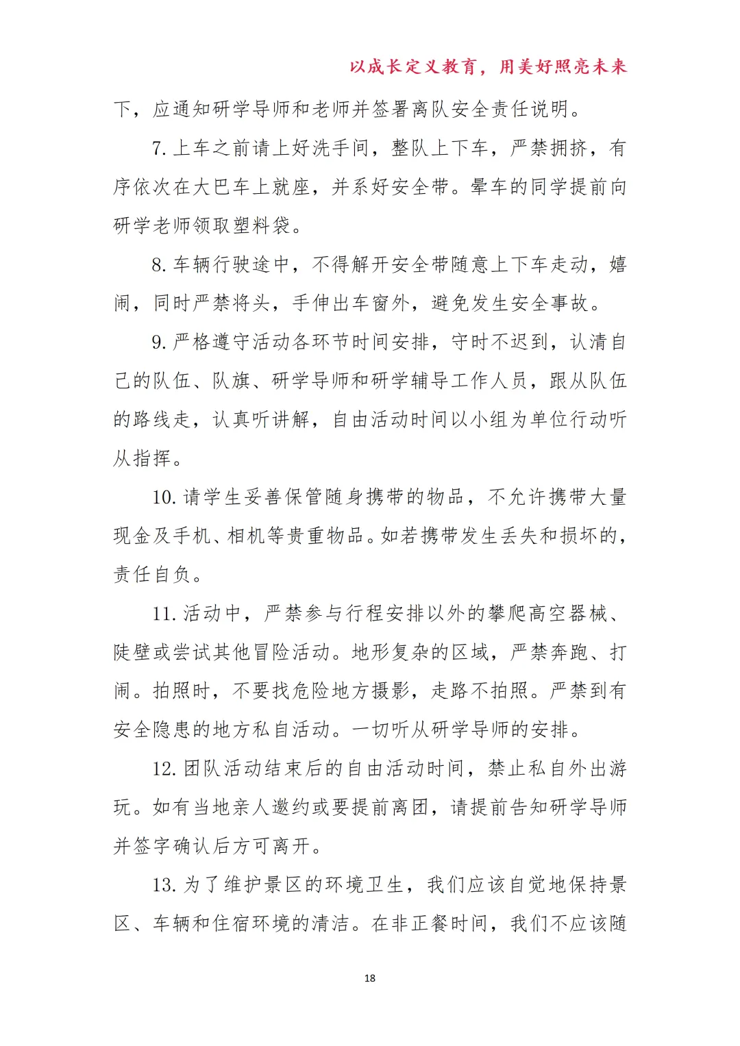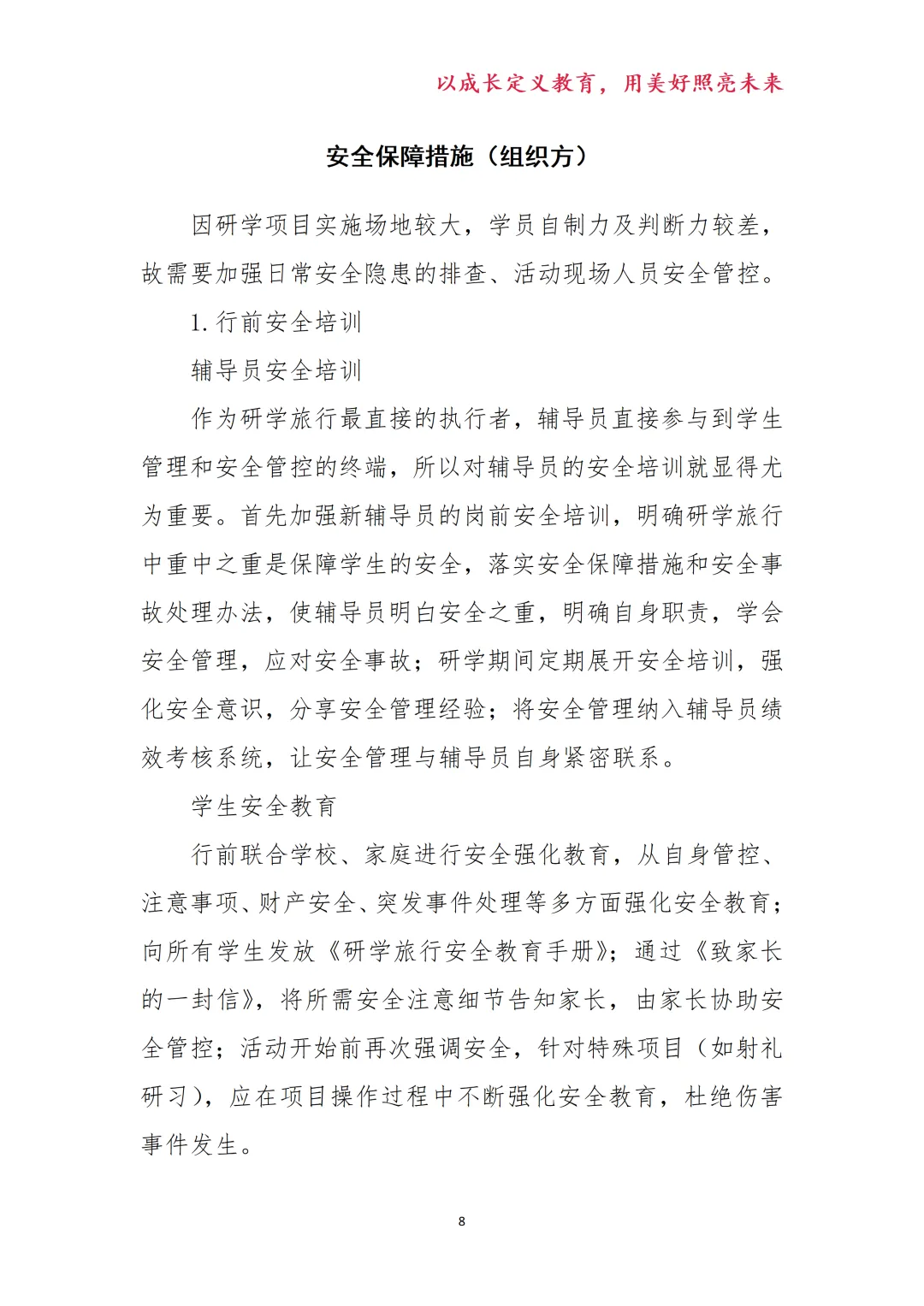 安全管理是贯穿研学旅行始终的,从项目策划的安全管控及场地管理,到行前的安全宣讲及安全告知书,从行中的项目实施及应急事件处理,到行后的安全情况反馈。安全管理是成体系有目的地层层落实、环环紧扣,每一个细节都是安全管理的重点,只有在每一个环节都做到有章可循,落实到人,综合管控,才能有效地保障研学旅行活动的顺利实施,才能使学生在研学旅行中安全无忧地学到知识。