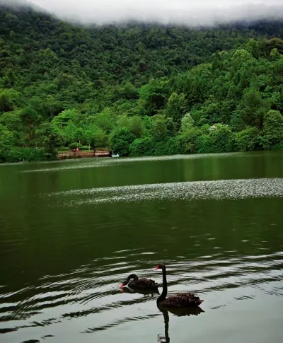 福鳌塘 古火山口形成的瑶池仙湖,湖面倒影如镜,清晨薄雾笼罩时分如入仙境