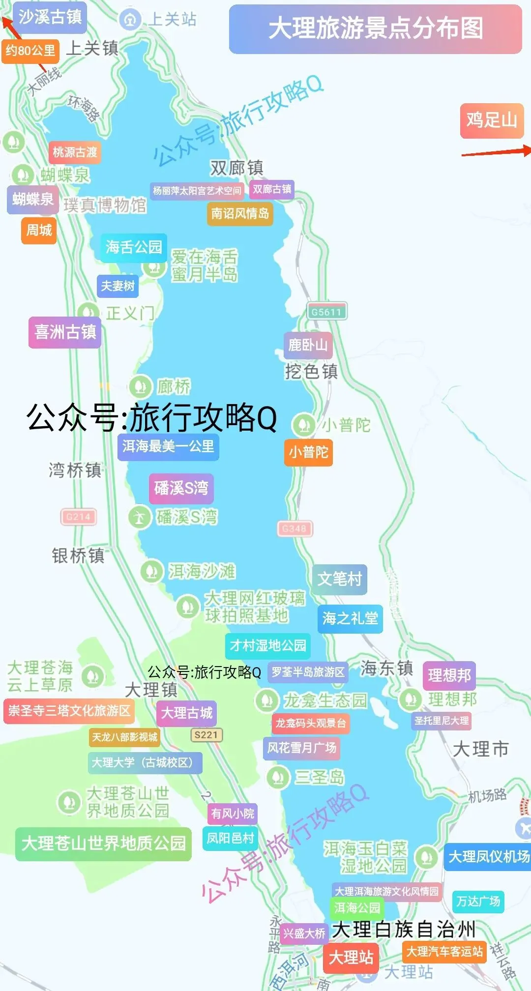 • 高铁:(没有高铁直达大理的城市建议到昆明转高铁)昆明站→大理站(约2小时,票价145元),出站后乘公交8路直达大理古城(约40分钟,票价3元)。