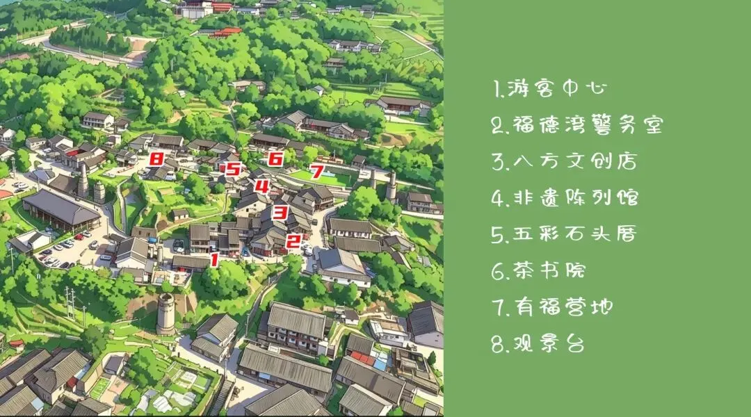 游客中心旁、福德湾警务室、八方文创、非遗陈列室、五彩石头厝后门、茶书院前、有福营地、观景台旁