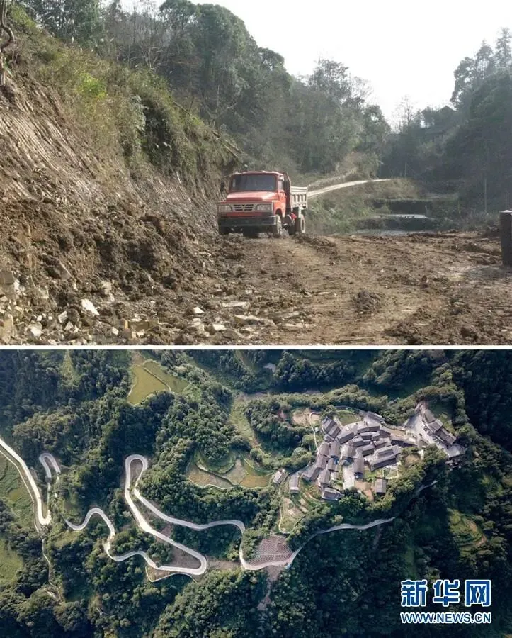 拼版照片:上图为脱贫前的湖南省花垣县十八洞村进村道路(2011年12月摄 新华社发);下图为2019年9月拍摄的湖南省花垣县十八洞村及进村道路(新华社记者陈泽国摄,无人机照片)。新华社发