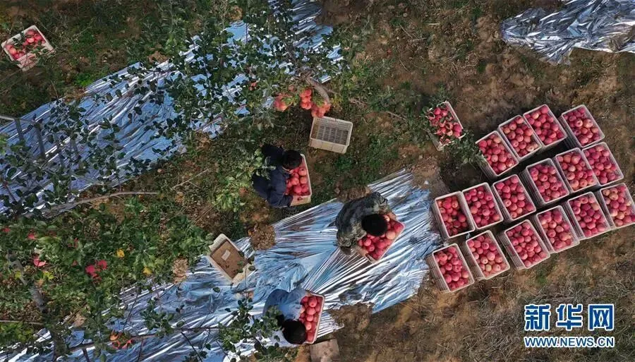 陕西省延安市志丹县双河镇李家湾村村民在果园采摘苹果(2019年10月22日摄,无人机照片)。新华社记者 陶明 摄