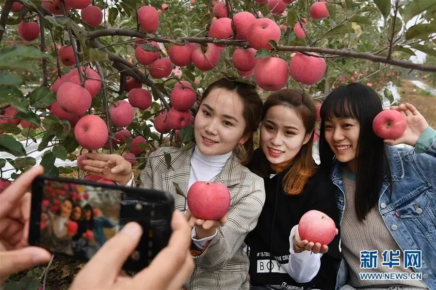 游客在陕西省延安市志丹县双河镇李家湾村果园拍照留影(2019年10月22日摄)。新华社记者 陶明 摄