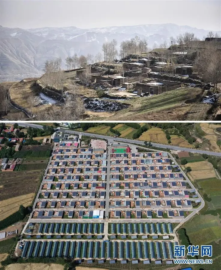 拼版照片:上图为2016年11月拍摄的脱贫前的青海互助土族自治县班彦村村貌(新华社记者吴刚摄,无人机照片);下图为2019年9月拍摄的青海互助土族自治县班彦新村村貌(新华社记者张宏祥摄,无人机照片)。新华社发