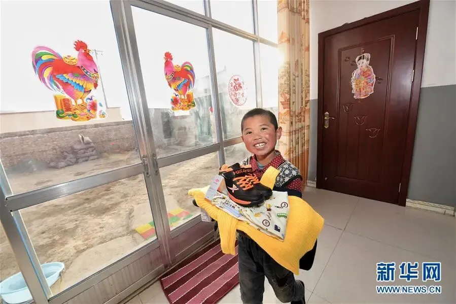 青海互助土族自治县班彦新村的儿童在刚迁入的新居内展示新买的衣服(2017年1月摄)。新华社记者 吴刚 摄