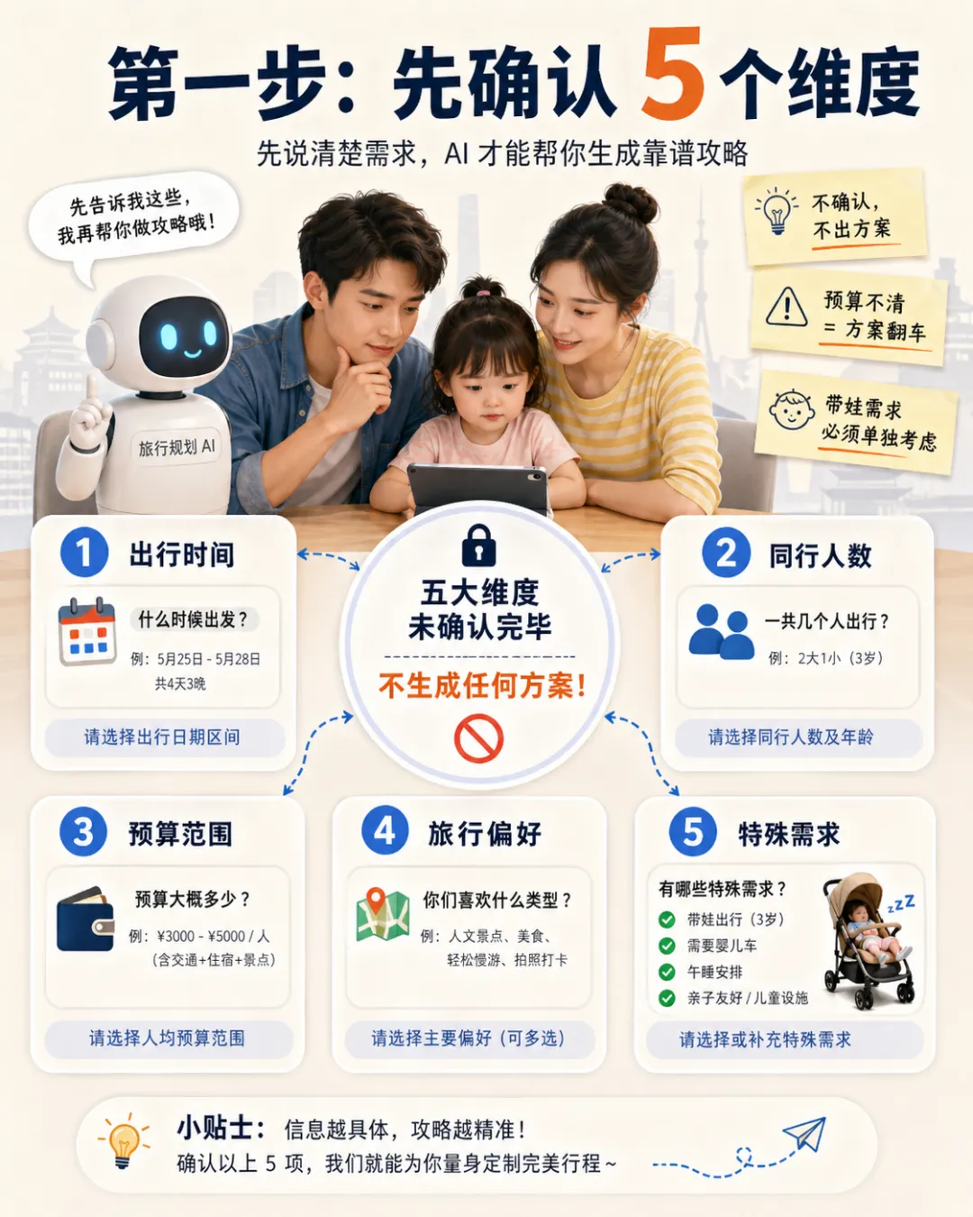 写进规则:必须先确认 5 个维度(时间、人数、预算、偏好、特殊需求),不确认不出方案。