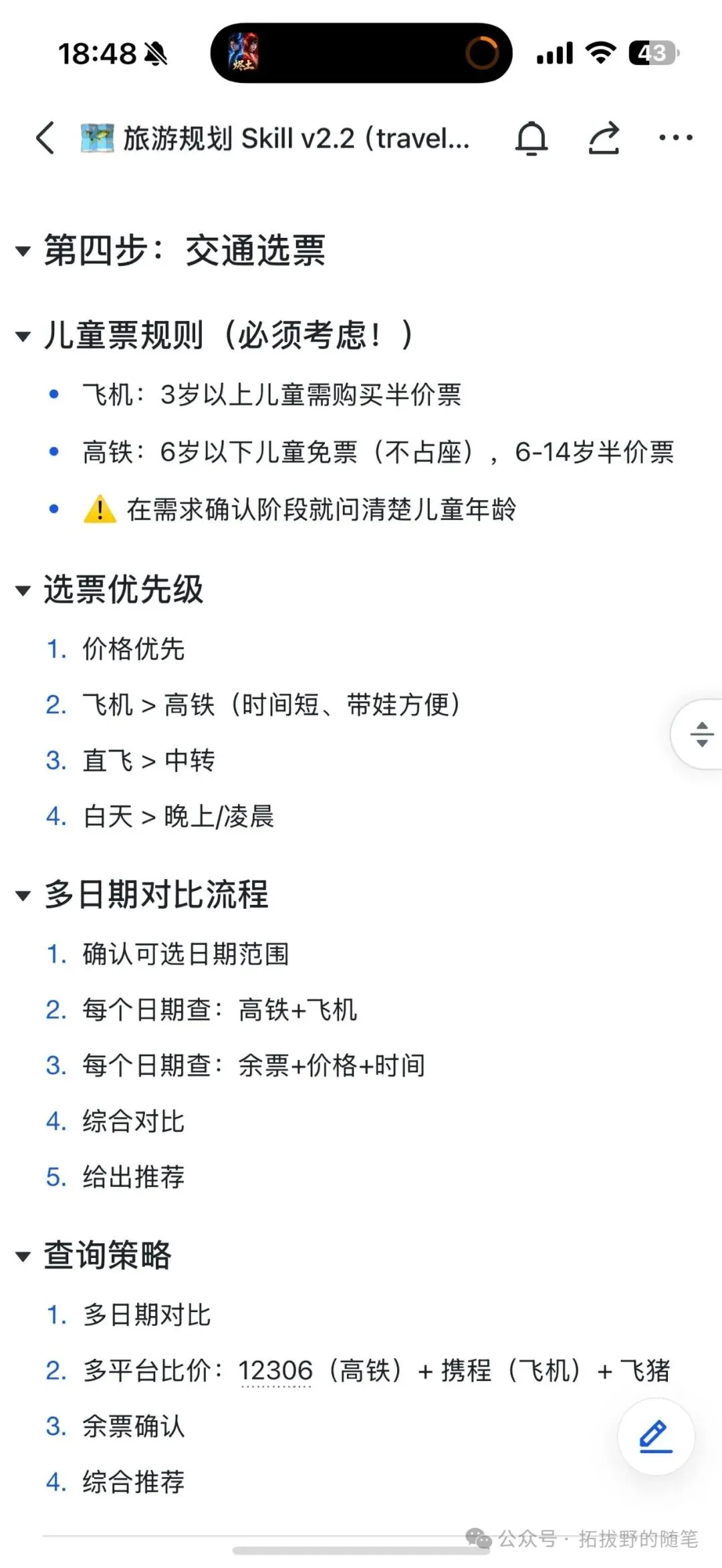 这两种规则,最早版本的 AI 完全没考虑。它按成人票价算总费用,结果预算超了好几百。后来我加了一条铁律:有小孩必须确认儿童票规则,高铁和飞机的规则不同,必须分别处理。