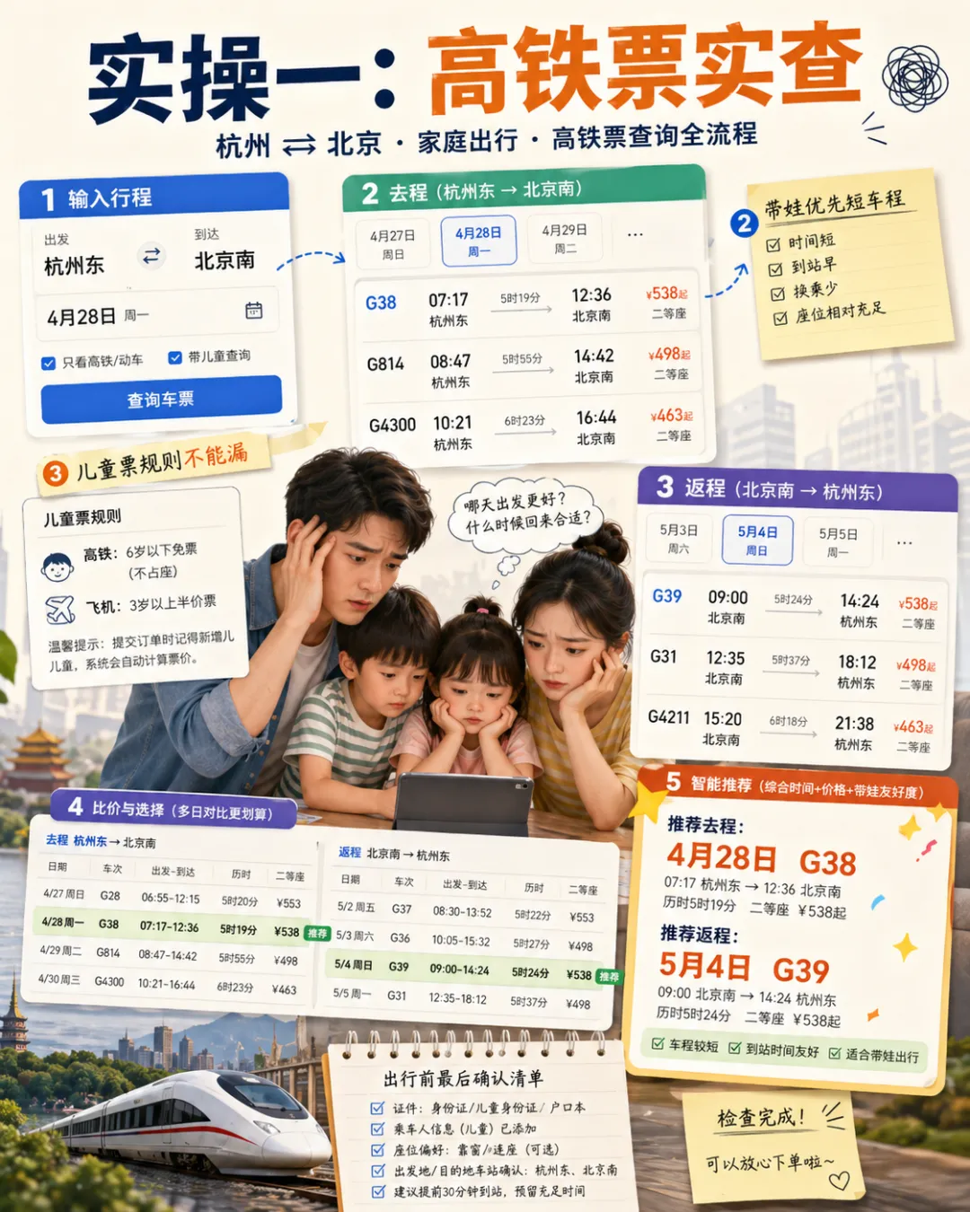 必须查前后日期——这是第二个坑。用户说4月26号出发,AI 只查了26号,结果二等座全卖完。后来改成查前后所有日期,发现27号大量余票。还有儿童票规则:高铁6岁以下免票,飞机3岁以上要买半价票。这两种规则完全不同,最早版本的 AI 完全没考虑。