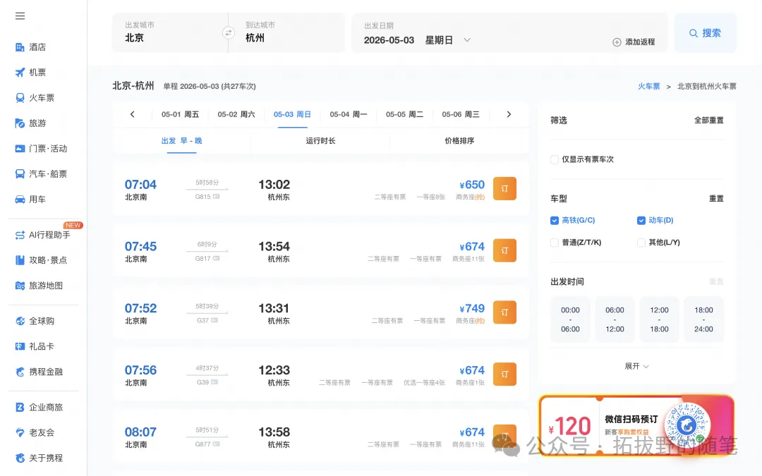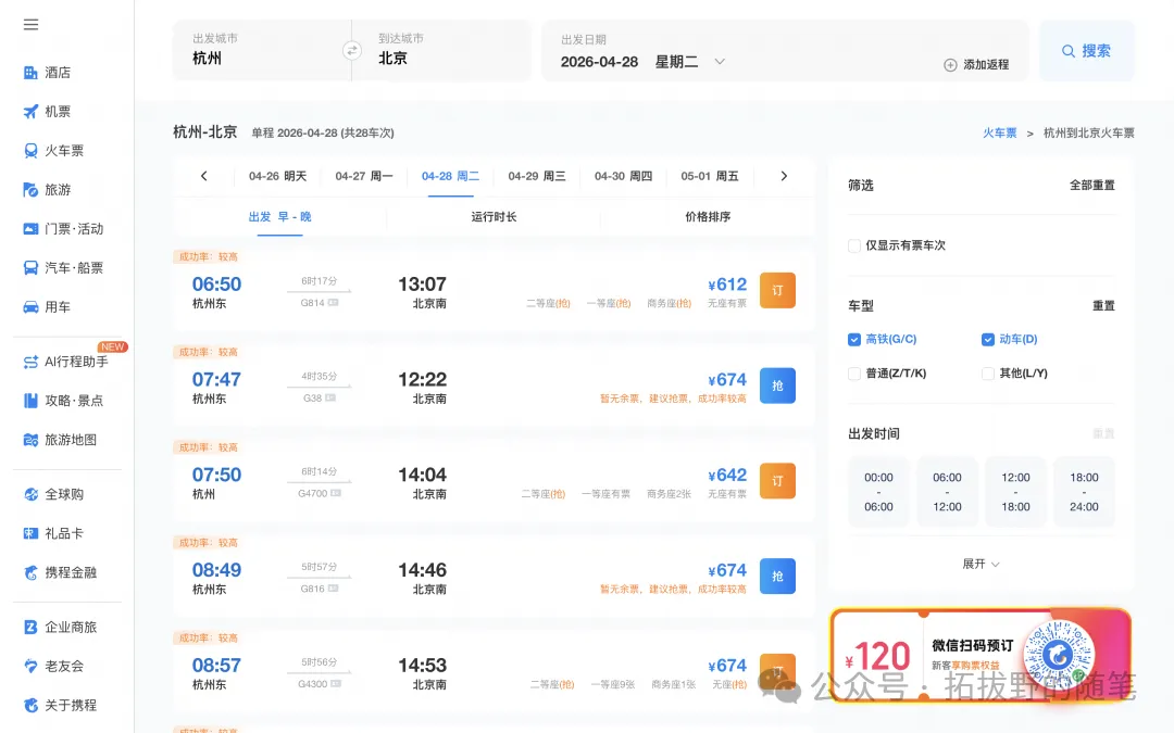 用户说4月26号出发,AI 只查了26号的高铁票。结果二等座全卖完。后来改成查前后所有日期,发现27号大量余票。差一天,天壤之别。