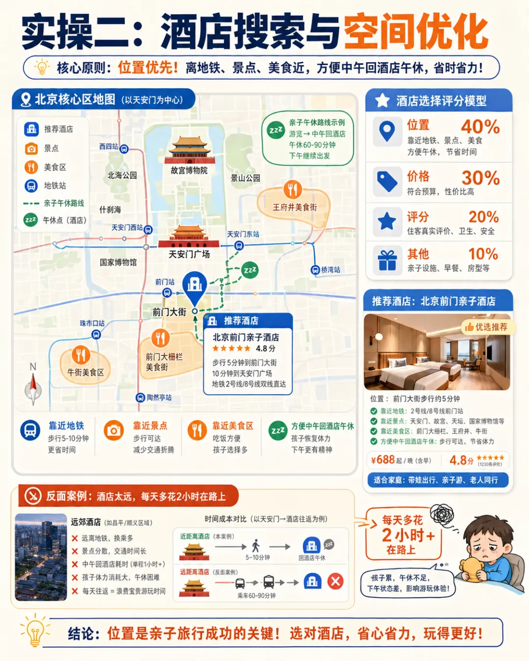 亚朵是带娃出行的热门选择。北京门店价格区间在 ¥300-500/晚,性价比不错。但 AI 不只是看价格和评分,它还做了一件事:空间位置优化。