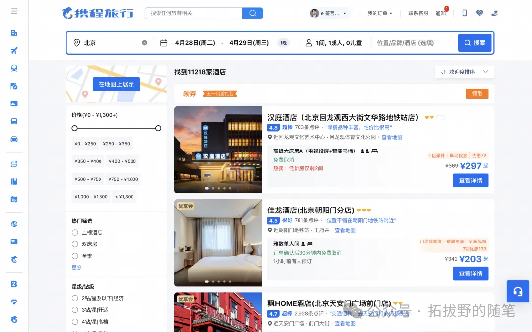 查完高铁,下一步是酒店。AI 去携程上搜了北京的酒店。