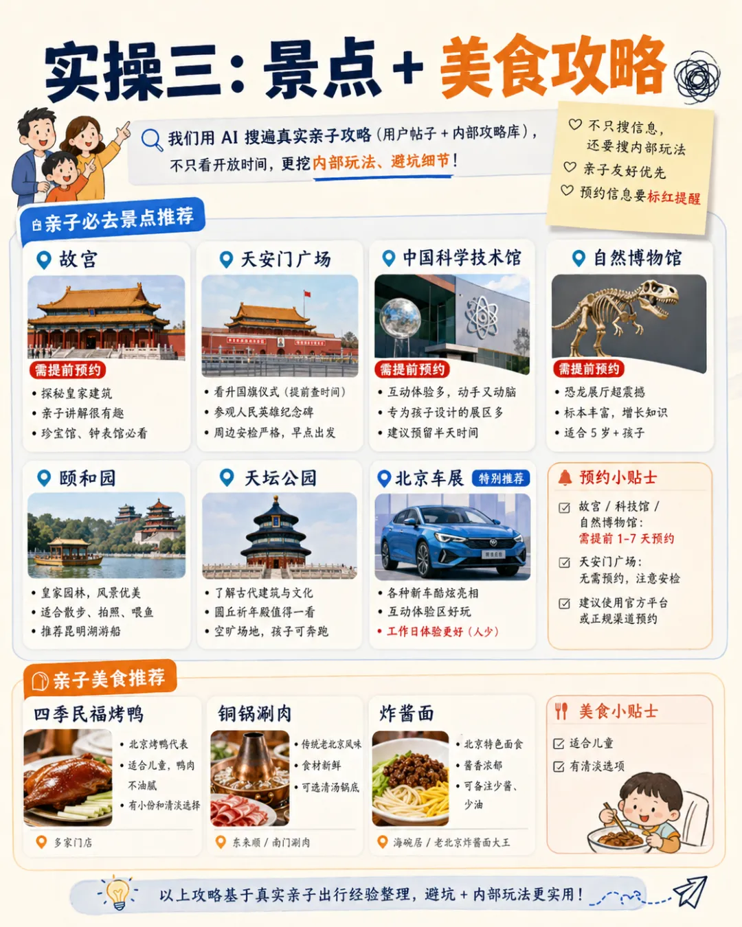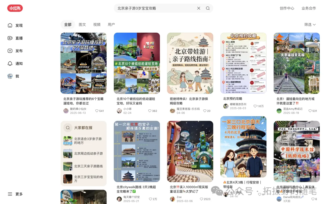 为什么是小红书而不是百度?因为小红书上有大量真实的亲子游攻略,都是家长自己写的,细节丰富——哪个景点适合推婴儿车、哪个餐厅有儿童餐、哪个时间段人最少。这些信息在百度上很难搜到。