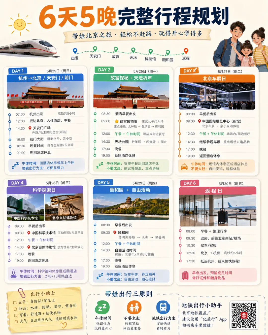 07:47 从杭州东站出发,乘 G38 高铁,12:22 到达北京南站。出站后地铁到酒店,13:00 左右入住亚朵前门店。午餐在酒店附近解决,简单吃碗炸酱面。14:30 出发去天安门广场,带孩子看看天安门城楼,拍拍照。16:00 逛前门大街,买点小吃。18:00 去四季民福烤鸭(前门店),吃一顿正宗的北京烤鸭。晚上早点回酒店休息,第一天别太赶。