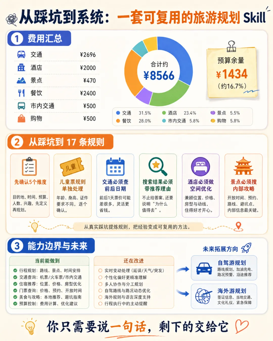 但这些限制都在缩小。Skill 从 v1.0 到 v2.2,每踩一个坑就升级一次。v1.0 只能列选项,v1.5 会推荐了,v2.0 考虑儿童票了,v2.2 会做空间位置优化了。下一个版本会更好。