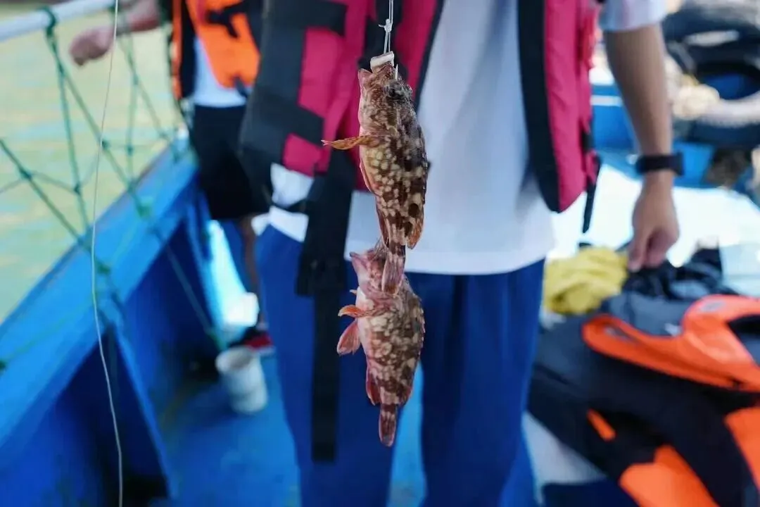 这里的海域富饶,虎头鱼、安康鱼、鳗鱼、带鱼、大黄鱼、螃蟹等海鲜时常出没。在专业船老大的指导下,抛竿、静待、收线,等待咬竿与未知的惊喜。