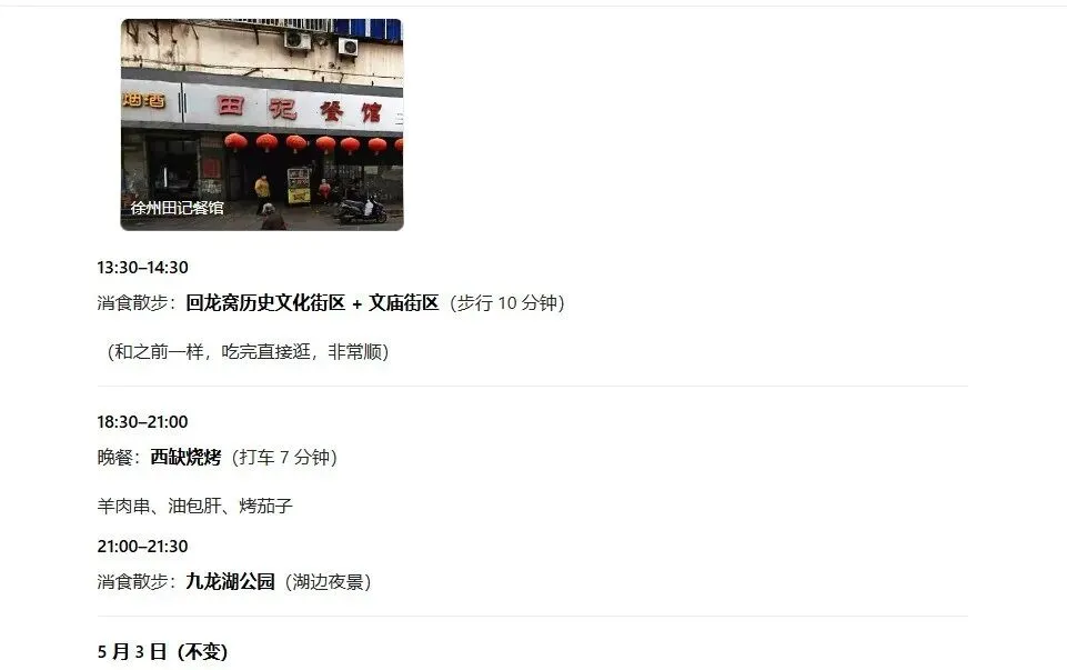 接下来我就告诉豆包我住在哪里,我想吃什么(早市、烧烤、米线),以及我的时间安排是什么,再加上博主提到的这些店名,让他给我做个规划,我原本以为模型对于那么多的店名是很难精准计算距离远近的,结果它不仅计算的很好,还能把店的图片显示出来,把离我近的博主提到的饭店都归纳进了我的日程里。