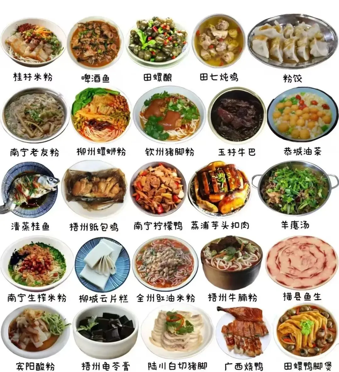 柳州:螺蛳粉(非遗美食,酸笋引爆味蕾,螺蛳熬汤配炸腐竹,在柳州,它就是遍布街头巷尾最日常的主食)、田螺鸭脚煲(鸭脚吸饱螺蛳鲜汤,紫苏提香,大排档里藏着桂中夜食图腾)、三江油茶(侗族特色,解腻又暖胃,一口解锁少数民族风味)、五色糯米饭(壮族特色,颜值与口感并存,藏着壮族人民的烟火智慧)。