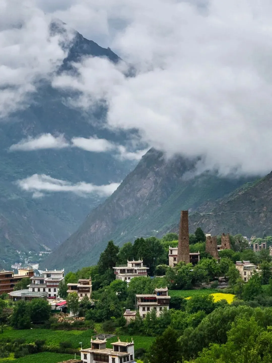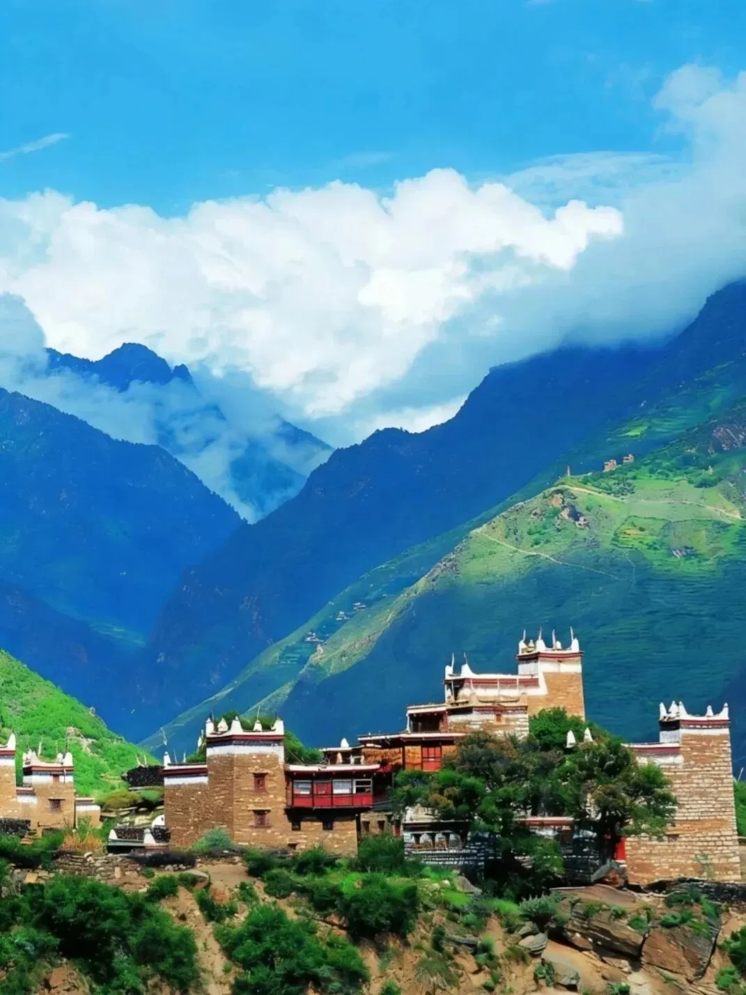 ✨雪山下的千碉之国,白墙红檐嵌在山谷,藏式风情拉满💕